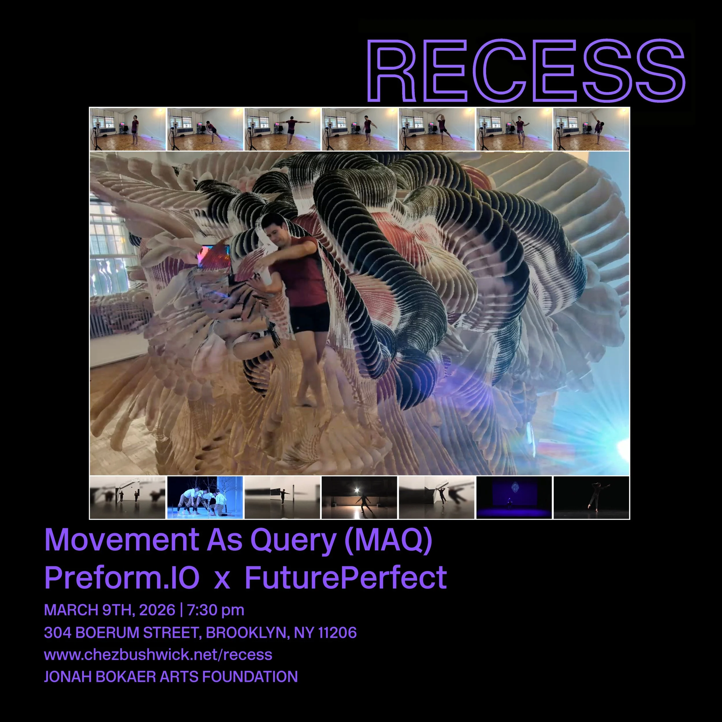 At RECESS, david allen, Aaron Juarez, and Jonah Bokaer will share their research process and demonstrate how live movement activates this living archive. This presentation will include working prototypes and an examination of the "thresholds" of the system—where it successfully recognizes movement and where it fails to see. Following the demonstration, audience members will have the opportunity to interact with MaQ first hand, followed by an open discussion on the future of movement as an interface.